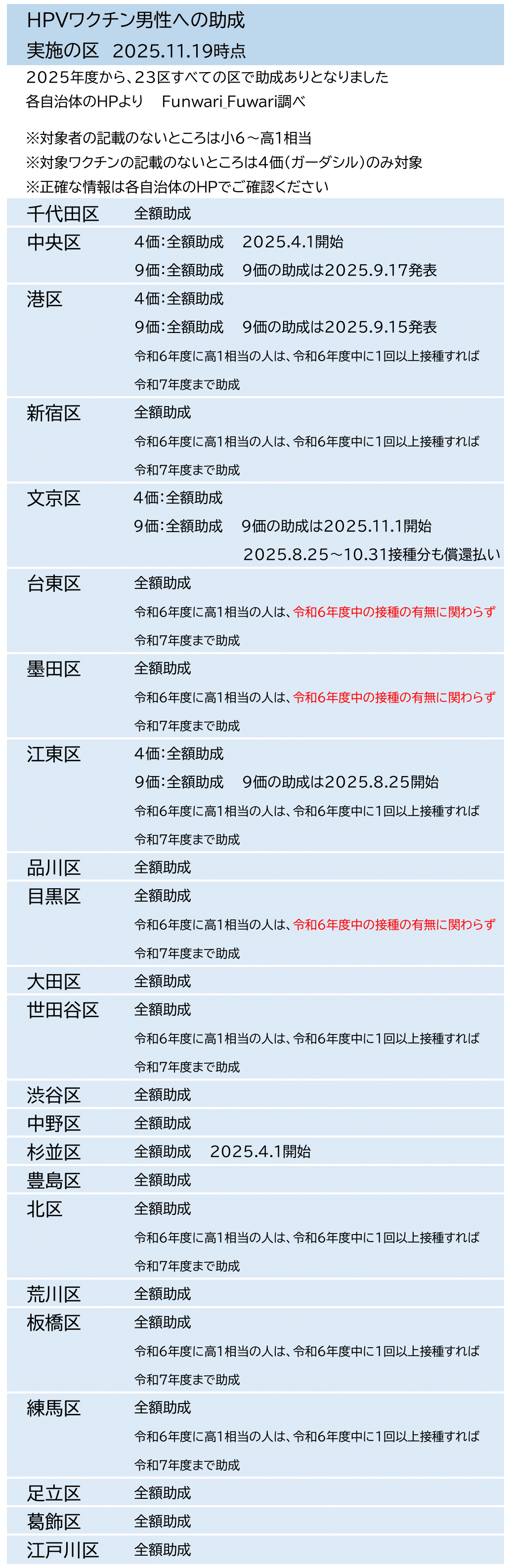 東京23区で男性のHPVワクチン接種に助成している区