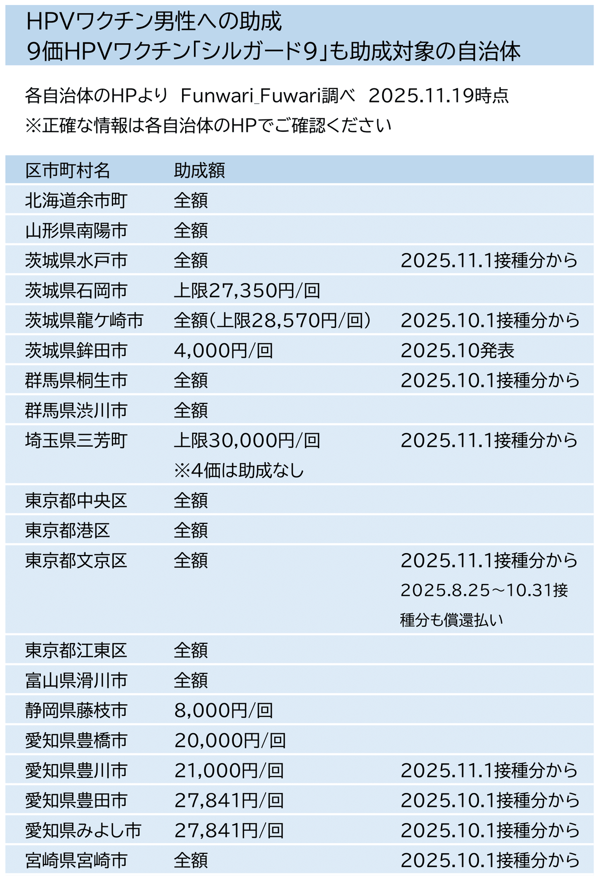 2025.10.3 宮崎県宮崎市、9価HPVワクチン追加2025.10.6 静岡県藤枝市、東京都文京区、9価HPVワクチン追加