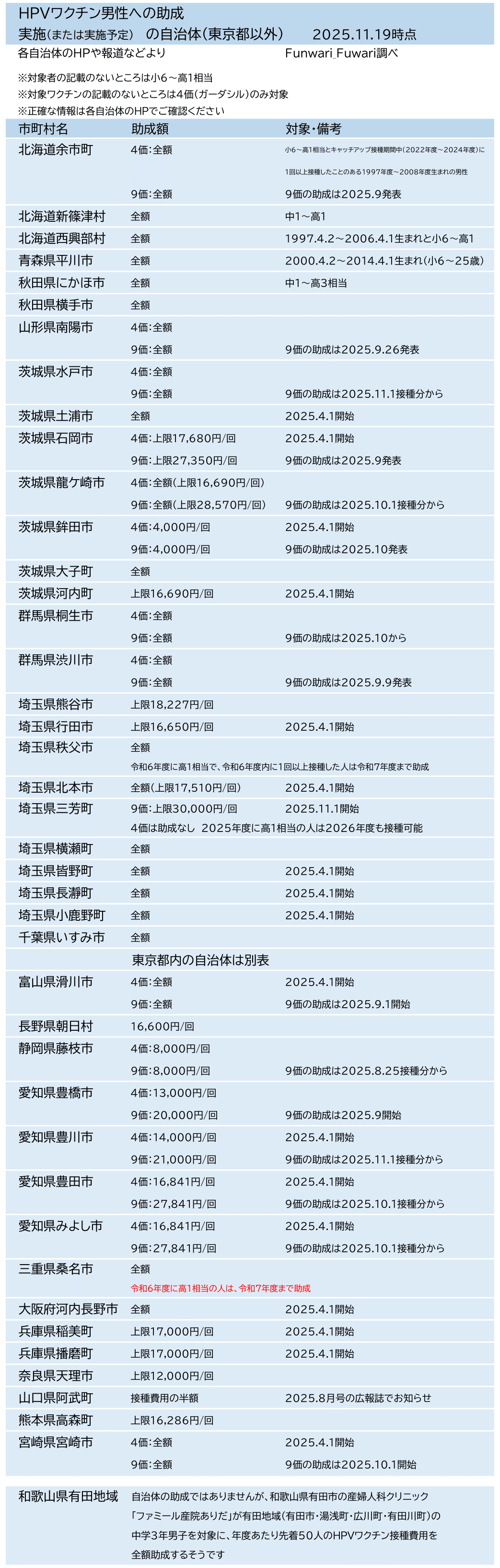 自治体の助成ではありませんが、和歌山県有田市の産婦人科クリニック「ファミール産院ありだ」さんが有田地域の中学3年男子を対象に、年度あたり先着50人のHPVワクチン接種費用を全額助成するそうです。HPVワクチン 男性への任意接種開始 有田の産院 中3には全額助成も /和歌山